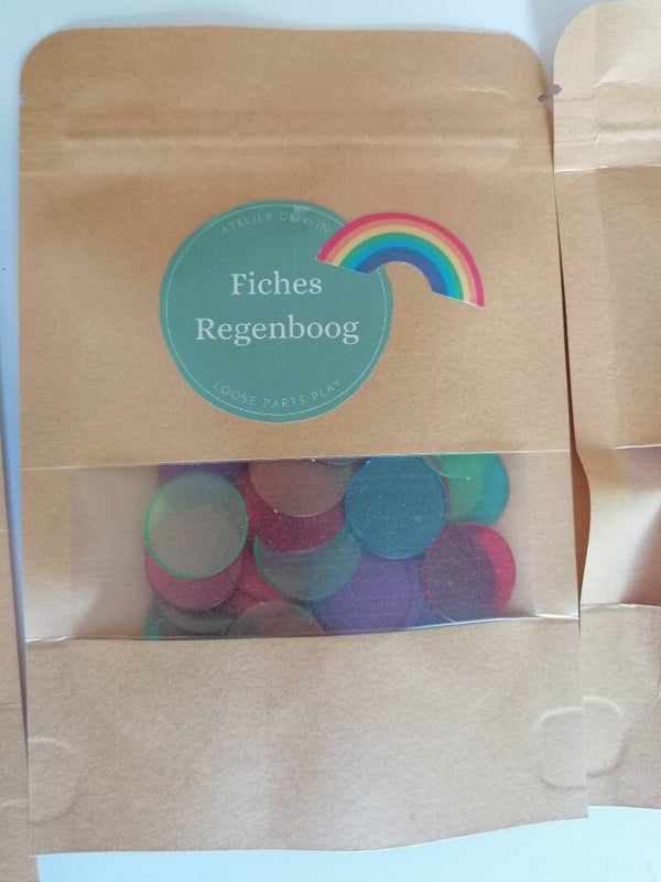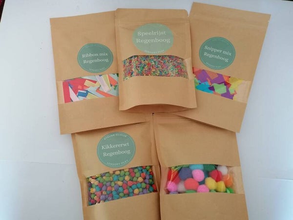 Een grote set met sensorisch materiaal in regenboog kleuren.