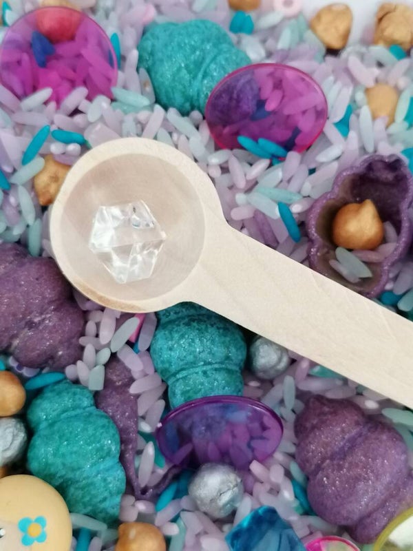 - 200gr meermin speelmix met rijst, pasta schelpen, gouden en zilveren kikkererwten, roze diamantjes, en polymeer vormpjes.