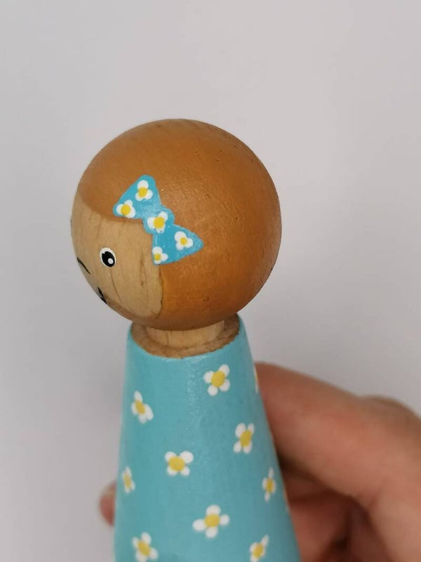 Een schattige pegsel dame in blauwe bloemen jurk